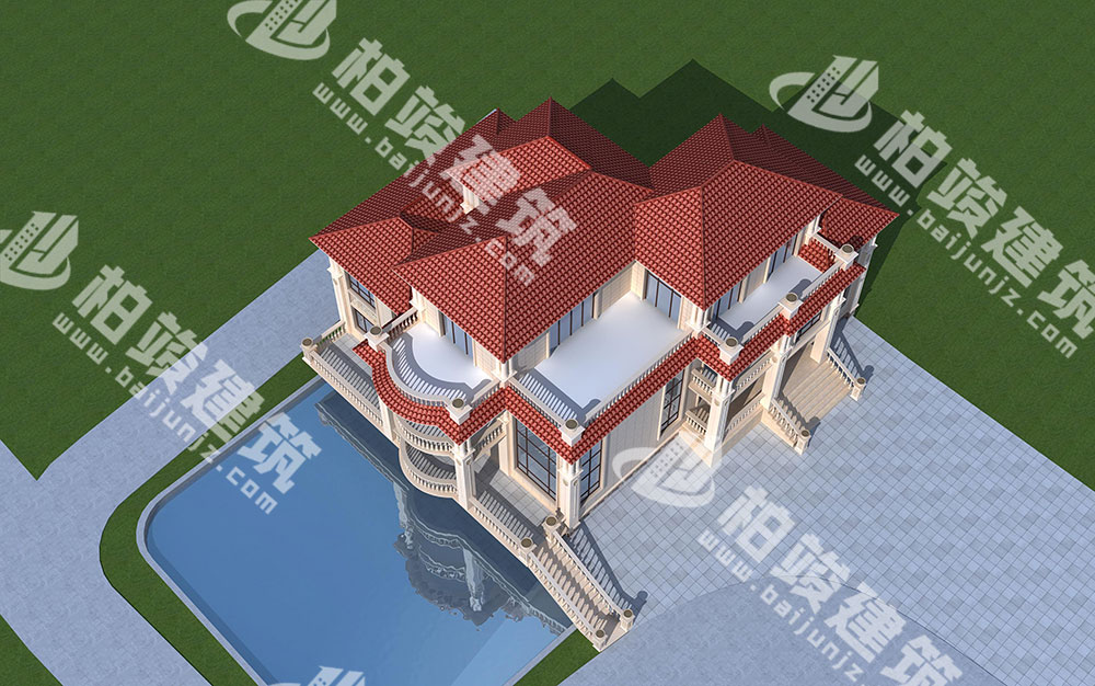 外墻裝飾:多層花瓶型護欄,搭配簡約羅馬柱、歐式花盆、浮雕,繁簡相間,視覺效果豐富不雜糅