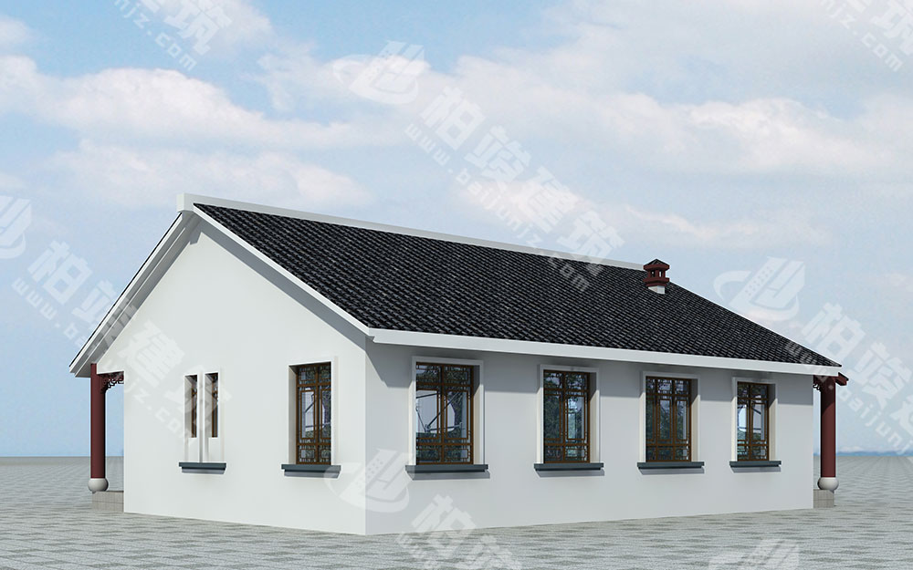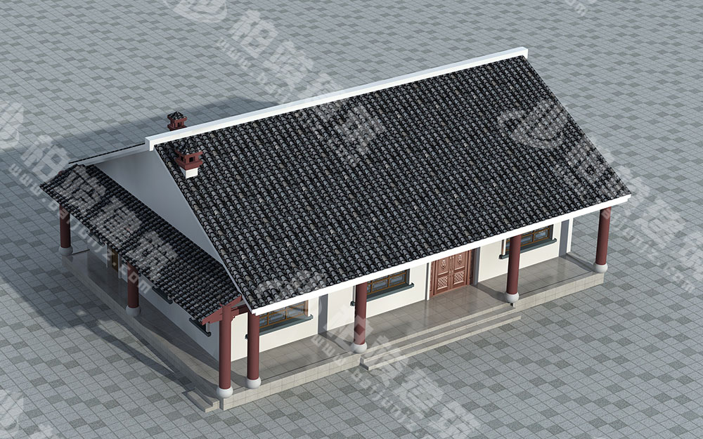 屋頂造型:黛青陶土瓦鋪設(shè)坡形屋頂,單側(cè)歇山頂蔭蔽游廊,造型古樸,寧靜悠遠(yuǎn)