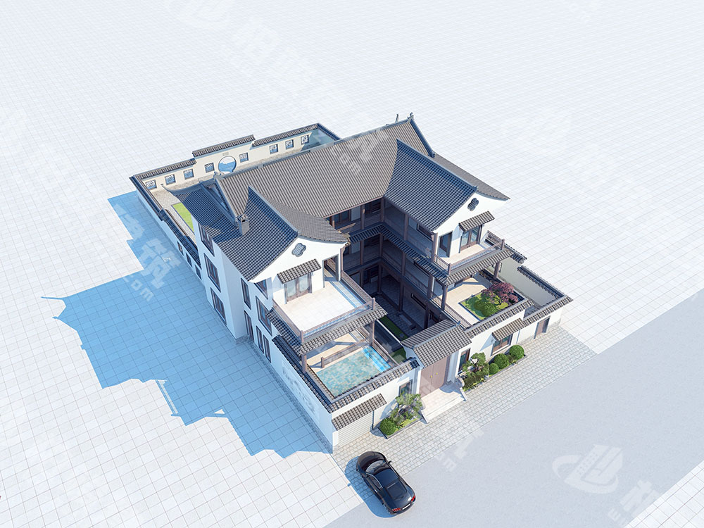 屋頂造型:傳統(tǒng)懸山頂+歇山頂造型,后院帶飛檐,宮殿般的大氣磅礴